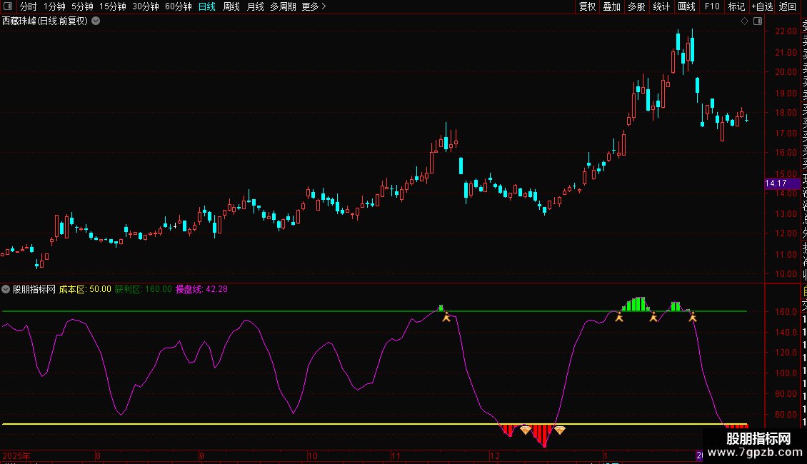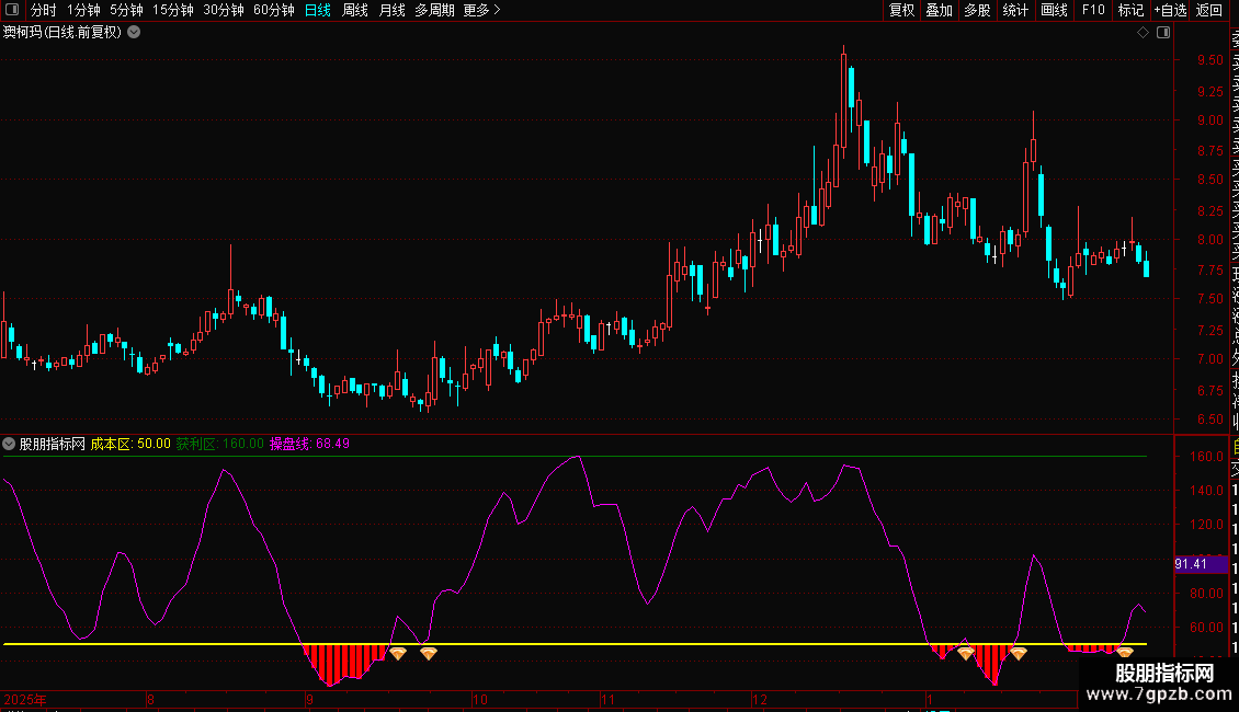 1. 主图信号系统:基于改良的随机指标(KDJ)计算出一条“操盘线”(N值)。它在K线图下方通过彩色柱状带和水平线,清晰划分出“关注区”(N<50)、“成本区”(N=50)和“风险/获利区”(N>160),并配有上穿50的买入图标与下穿160的卖出图标。