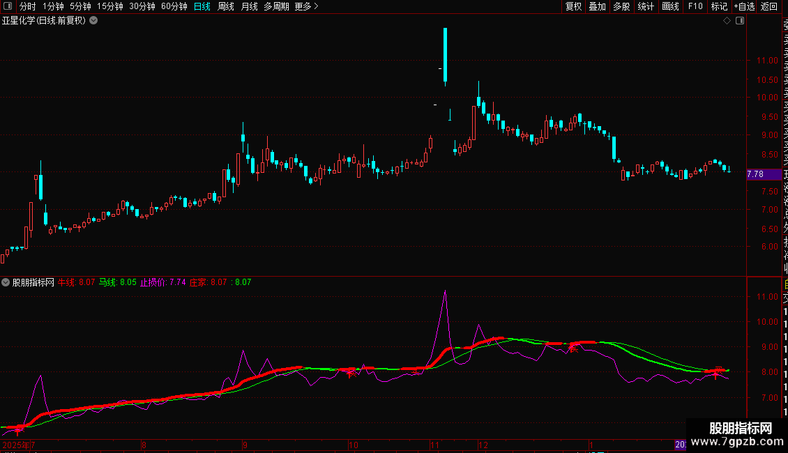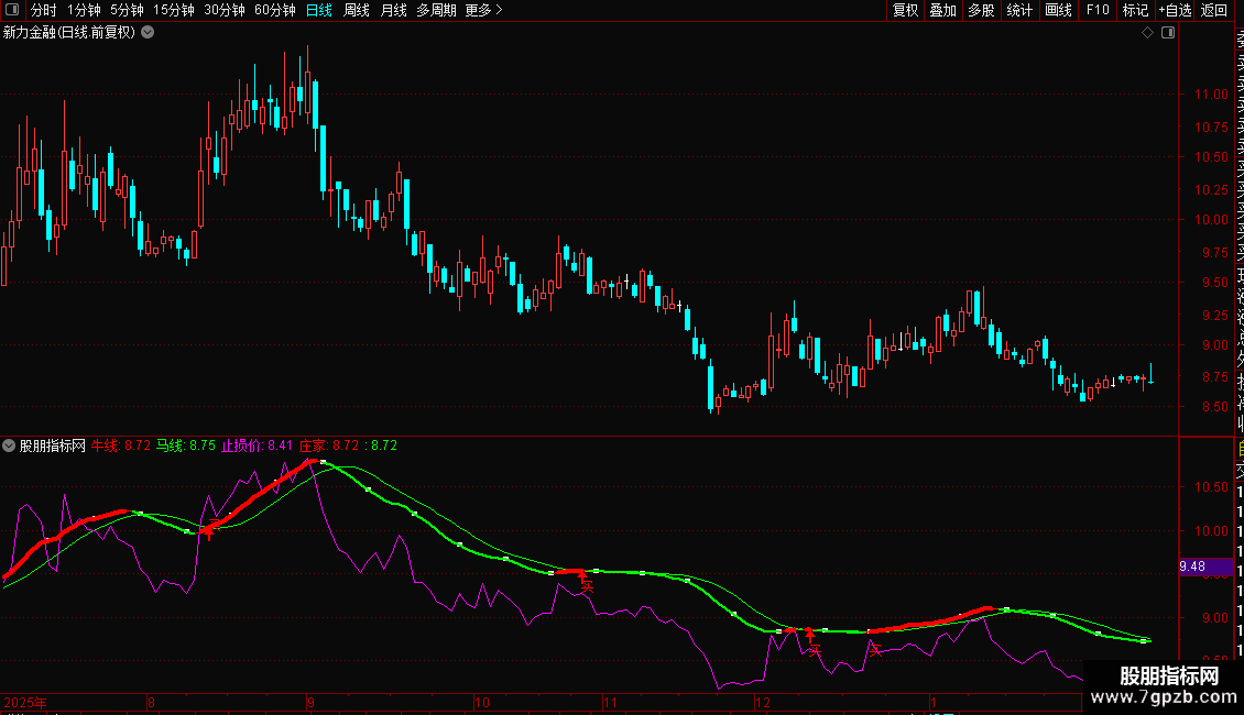 4. 庄家线:其算法与牛线完全相同,但通过红粗(上涨)、绿细(下跌)的线型变化,直观显示短期趋势的强弱方向。