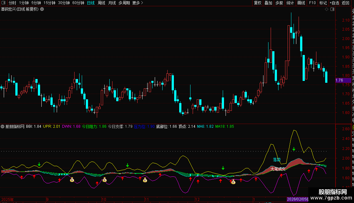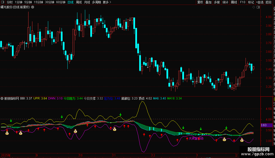 1. 多空布林通道 (UPR/DWN):基于BBI均线计算上下轨,用于识别趋势和波动区间。