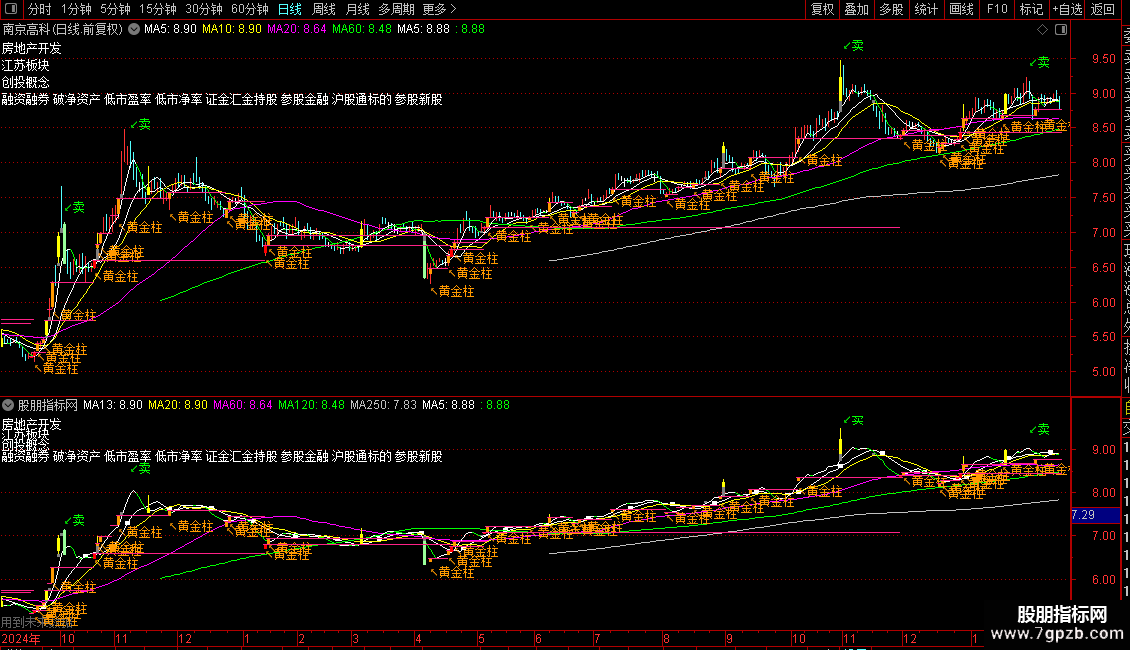 4. 核心功能 - “黄金柱”识别:基于“量学”理论,通过复杂的量价关系(如价升量缩、均价抬升、不破基柱顶底等)条件,自动识别并标记出多种类型的“黄金柱”和“元帅柱”,并用不同颜色(如蓝色、深蓝色)在K线上进行标注和文字提示。