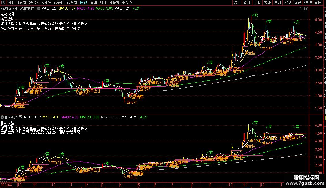 1. 多周期均线:显示13、20、60、120、250日等多条均线,并标注5日均线,当其下跌时显示为绿色。