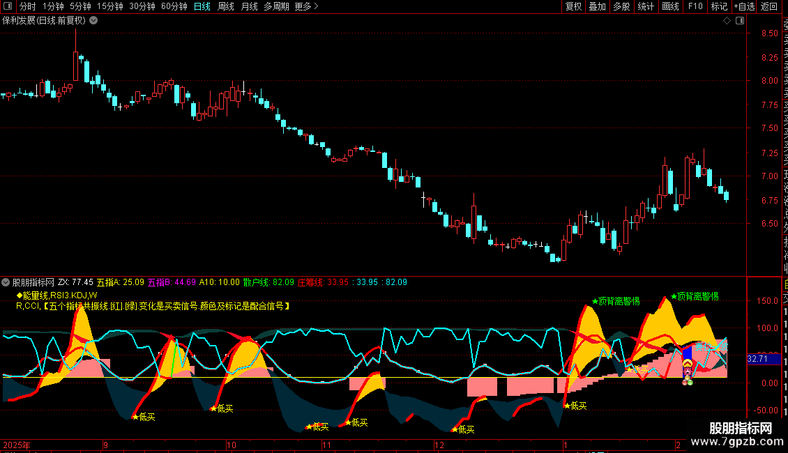 2. 多指标共振:将“能量线、RSI、KDJ、威廉WR、CCI”五个常用指标进行加权融合,生成“五指A”和“五指B”两条共振线。其金叉、死叉以及颜色变化(红绿)用于识别买卖共振信号。