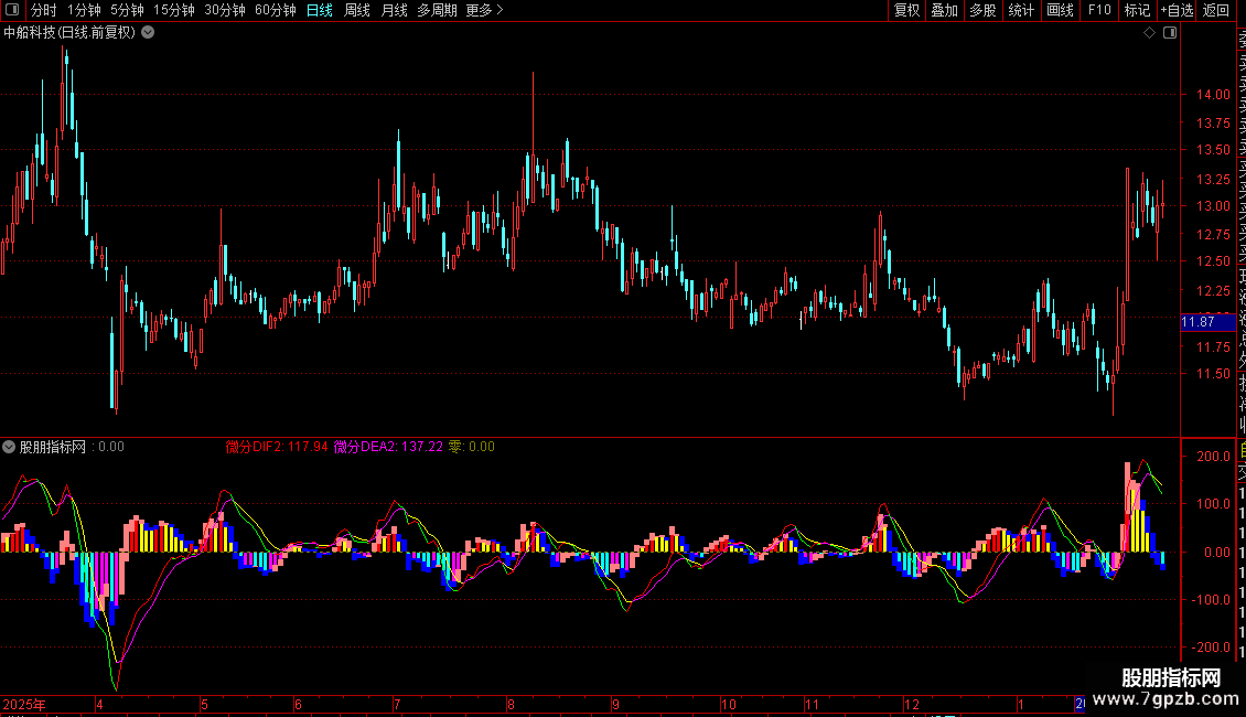 1. 核心部分:基于MACD原理构建的“微分”系统,包含DIF和DEA两条快慢线,以及柱状图(MACD2)。柱状图用四种颜色区分涨跌状态。