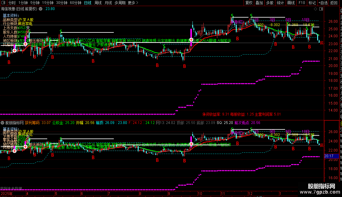 指标为主图叠加指标。加载后,K线图区域将叠加均线、箱体线、买卖点图标和过峰提示。图表四周固定位置会显示股票的基本资料、财务数据和资金流信息,方便用户在进行技术分析时同步查阅基本面情况。