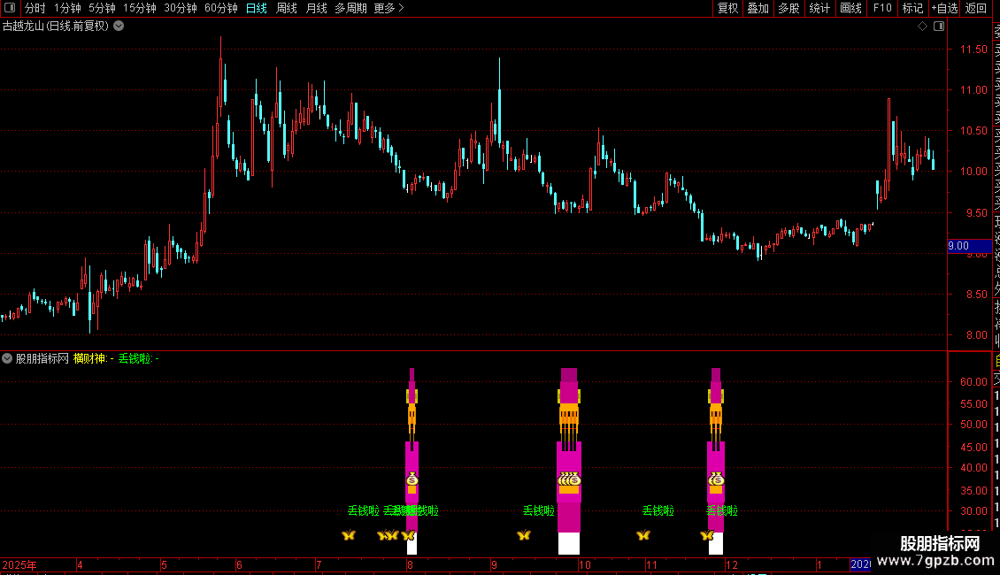 “元宝/丢钱啦”信号:在“财宝”的背景下,当快速随机指标(J11)在低位形成特定形态(X)并开始拐头向上时触发。该信号会标记为“丢钱啦”文字和图标,提示可能的转折点。