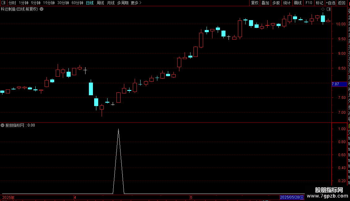 指标通过计算5、15、30日三条均线的相对位置关系,来识别短期趋势的潜在转折点。它主要包含两个信号逻辑:一是利用均线差值比率(LSL)的特定变化模式(如小于-5且近期出现特定拐点)来捕捉超卖反弹机会;二是结合一个辅助条件(AD)来过滤信号,旨在提高信号的可靠性。指标在图表上特定位置(第129根K线处)会标记一个黄色文本作为参考点。整体上,这是一个用于寻找短期均线系统背离后可能产生买入时机的趋势类指标。