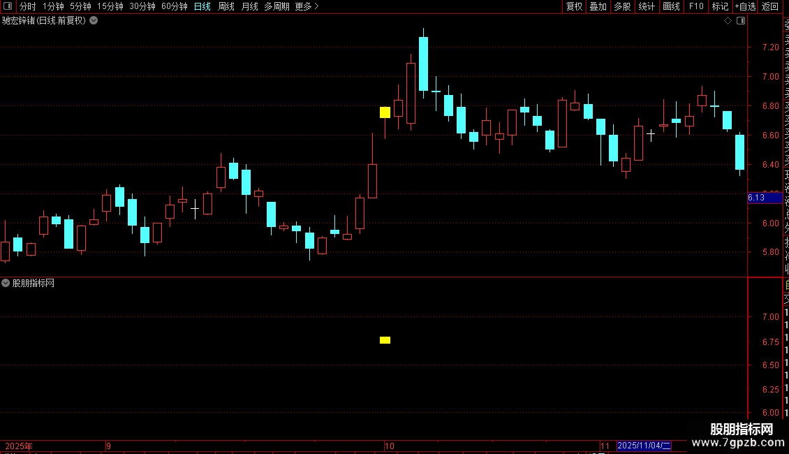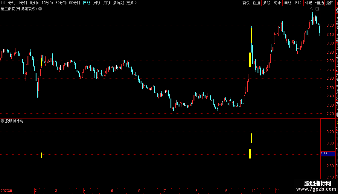 - 加载至副图后,可在符合条件的K线上看到高亮柱状标记,辅助判断短期强势走势。