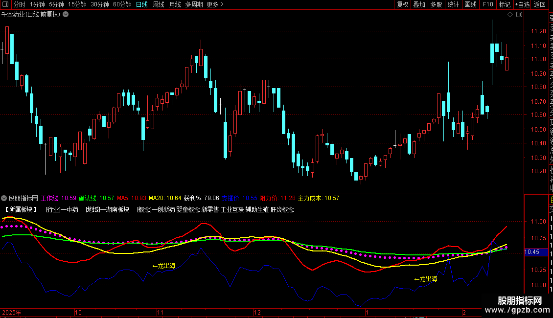 板块信息:在图形左上角固定显示股票所属的行业、地域和概念板块。