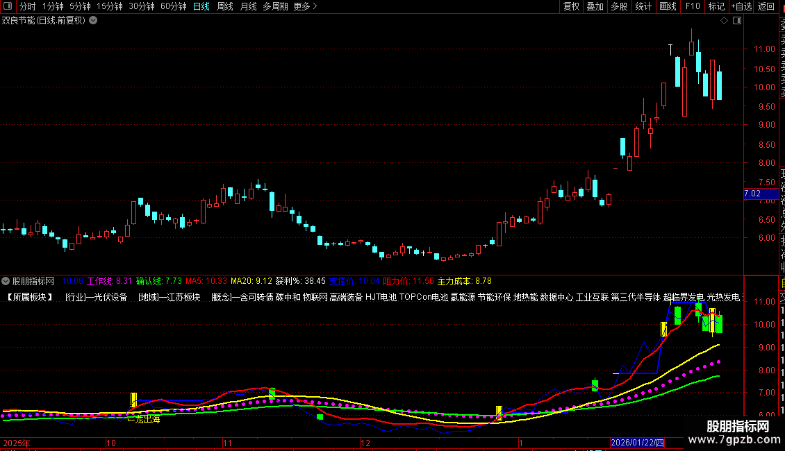 3. 多周期均线系统:包含5日、20日短期均线,以及40日(工作线)、62日(确认线)中期均线,用于判断趋势和支撑压力。