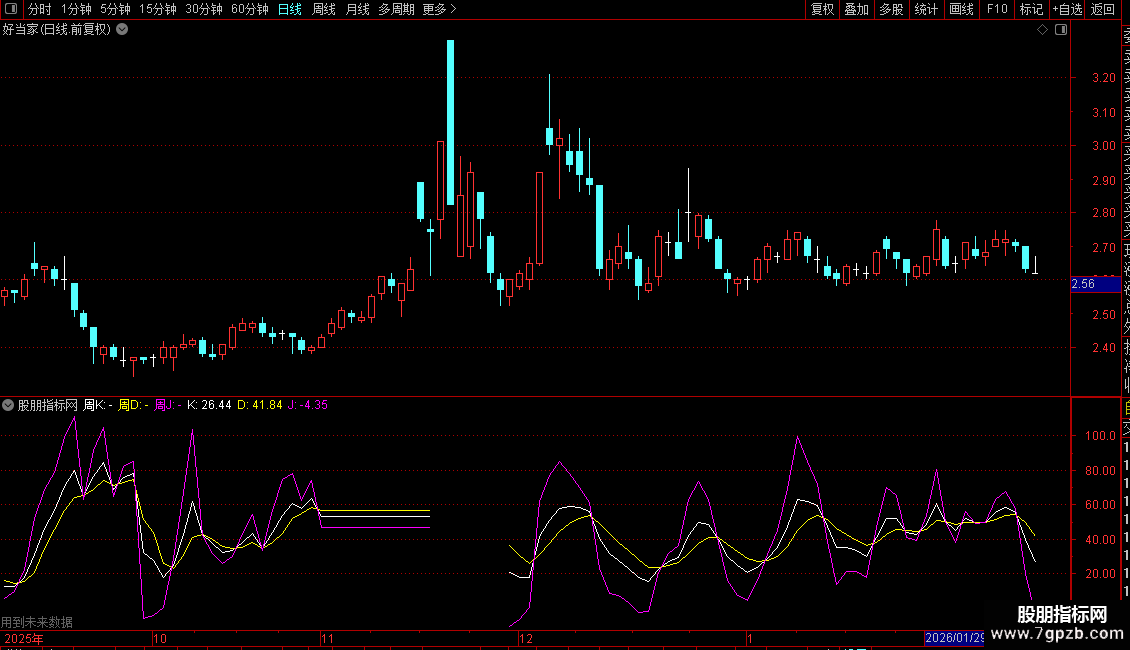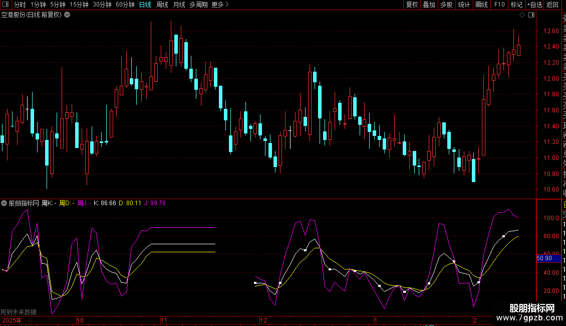 - 通过不同颜色区分K、D、J线,并用文字标注周期。