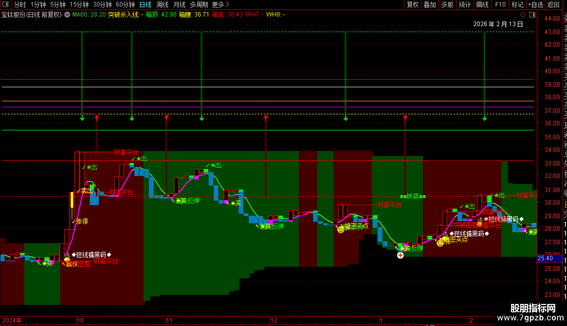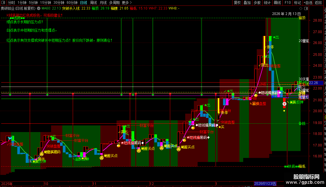 指标信号繁多,覆盖了趋势、形态、支撑阻力、量价等多个维度。使用者应重点关注多信号共振的区域(例如,关键价位线、箱体边界与买卖信号重合),并结合价格实际走势进行判断,避免单一信号带来的误导。指标中的文字注释(如K线底部出红色可低吸)提供了基本的操作思路参考。