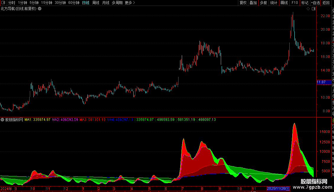 3. 均线上升时显示彩色线条,下降时显示绿色线条。