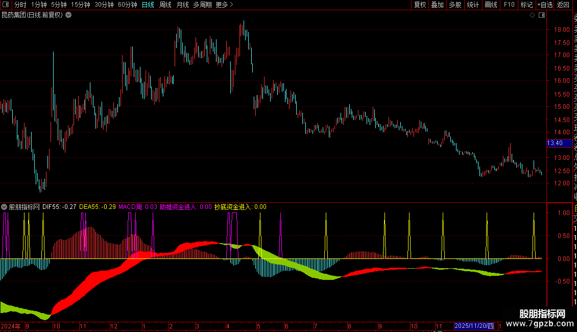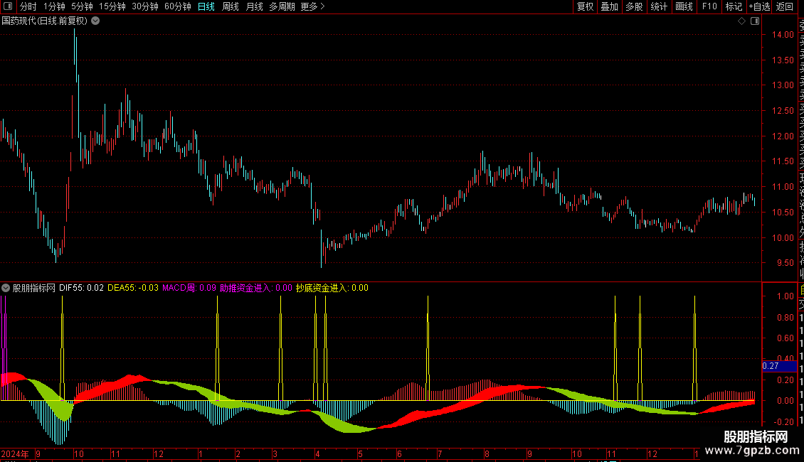 指标会在副图绘制MACD风格的曲线和柱状图,直观显示资金趋势。