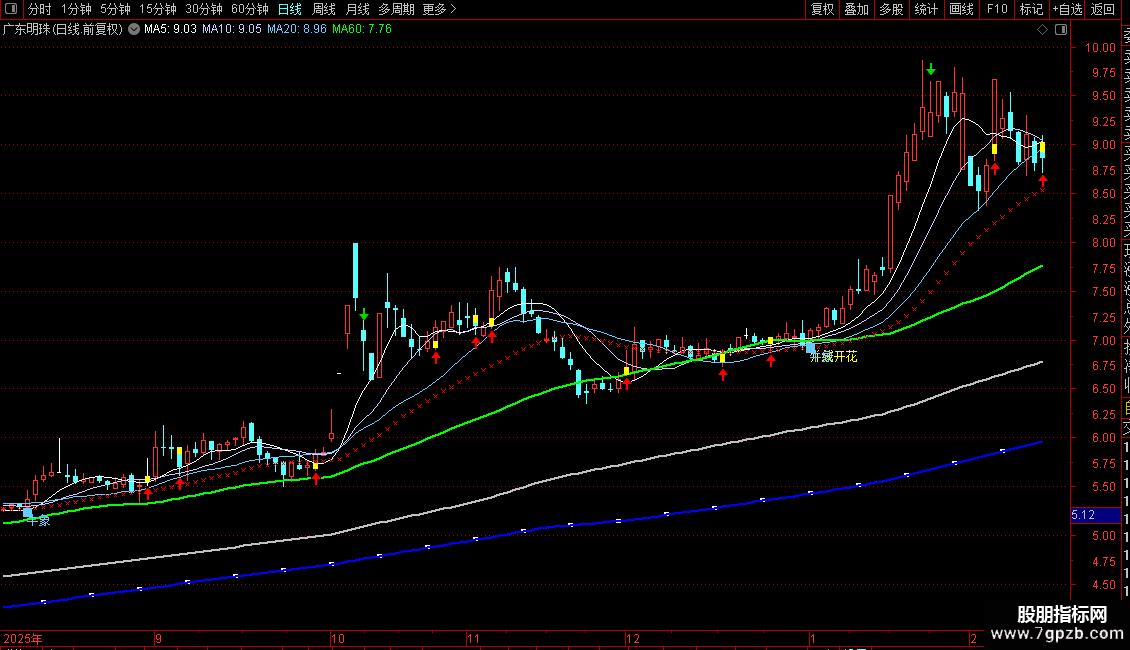 DRAWTEXT(CROSS(C,MA2) AND CROSS(C,MA3) AND CROSS(C,MA1),L-0.13,'并线开花'),COLORYELLOW;