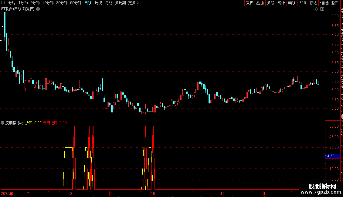 末日绝底信号: 当指标显示为30的红色粗柱状线时,表示“抄底”信号刚刚消失,可能意味着一个更强烈的底部确认点或“绝地反弹”机会。