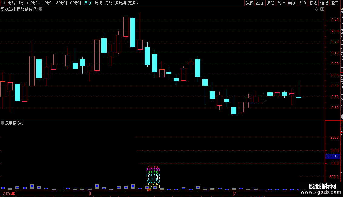 4. 资金流向:结合Level-2数据,在K线实体内部通过颜色变化(紫红色/绿色)直观显示大单资金的净流入/流出状态。