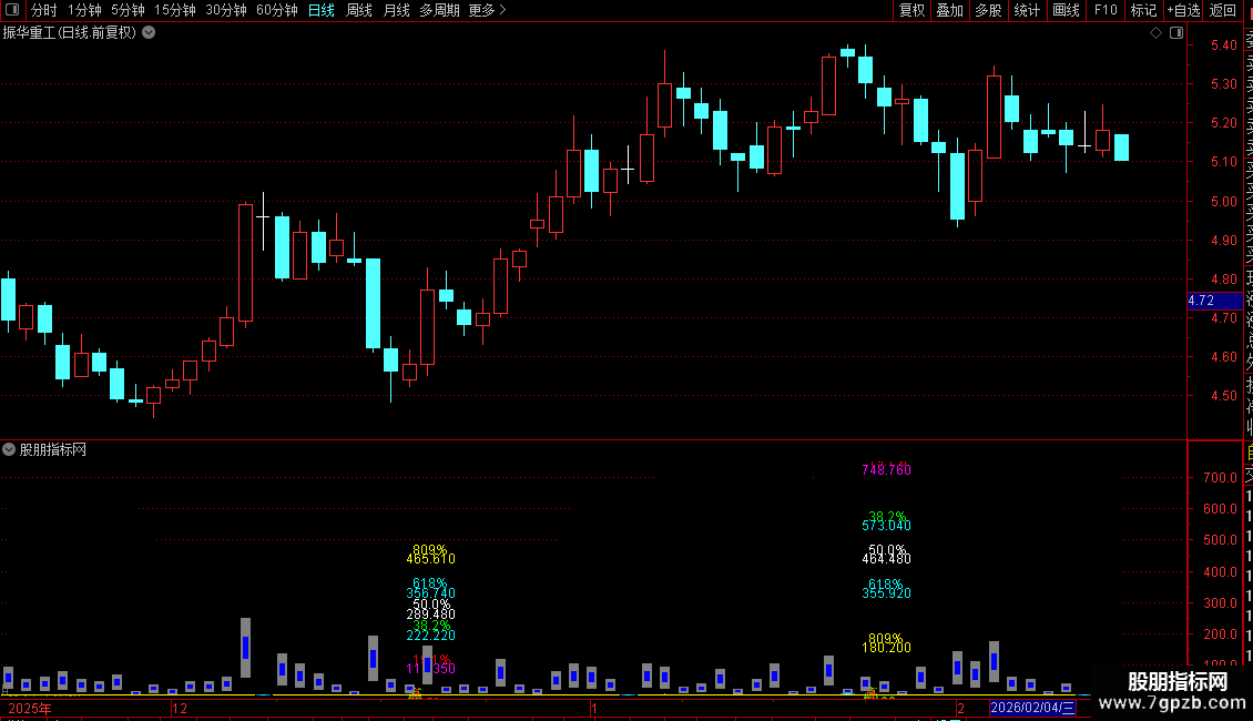 2. 黄金分割:自动识别波段的高低点,并绘制出多个关键黄金分割位(如0.191、0.382、0.618等),以彩色带状区域和具体数值显示。