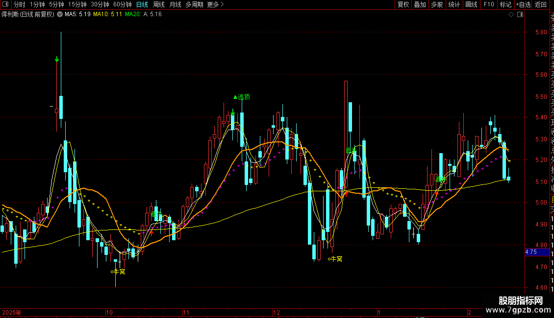 彩色均线(黄、粉、青)用于观察短期趋势与支撑压力。