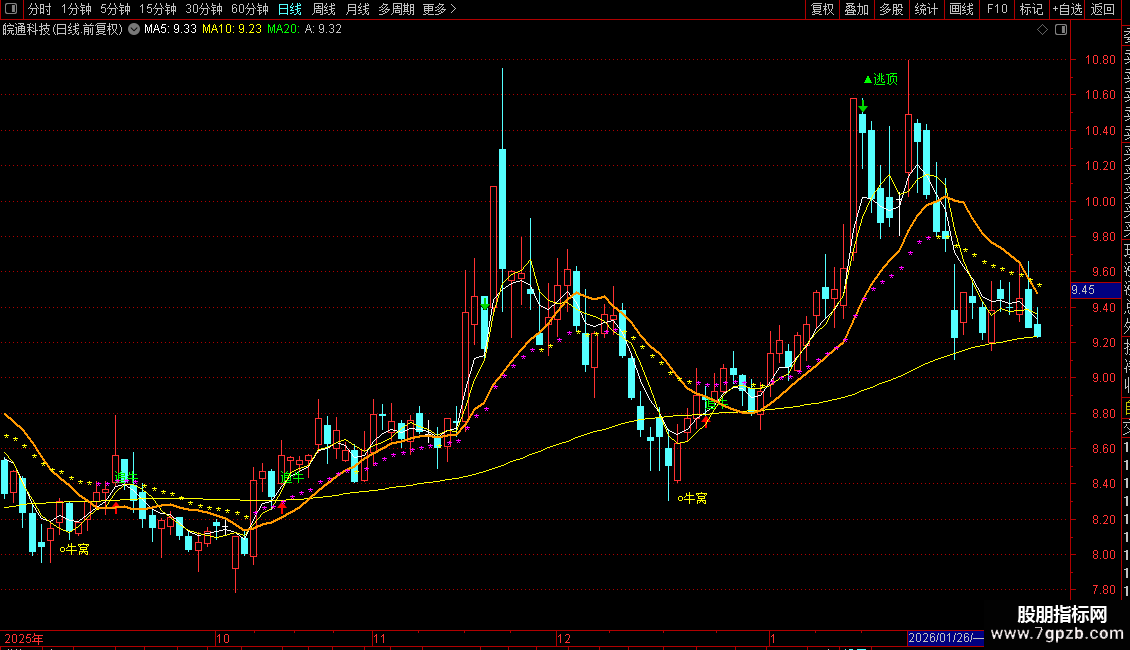 指标会在主图K线上绘制文字(如“追牛”、“逃顶”)和图标来直观标记信号点。