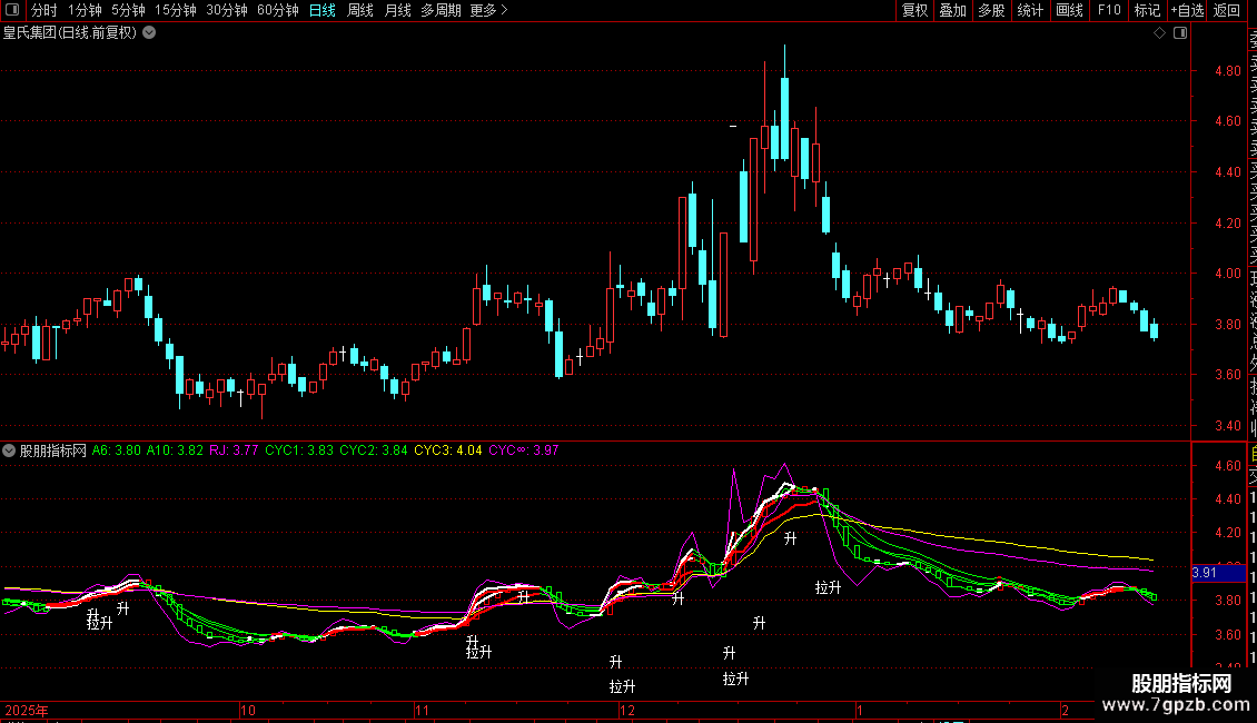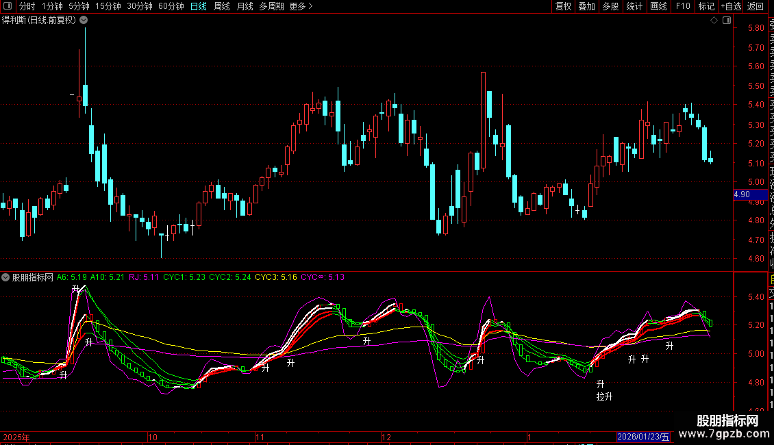 副图:用于观察股价与各条均线、成本均线的相对位置关系,以及“升”/“拉升”信号的出现,辅助判断趋势和入场时机。