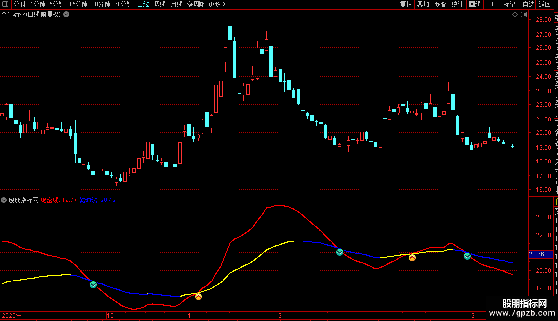 卖出信号:当乾坤线向上穿过绝密线时,在乾坤线位置显示卖出图标。