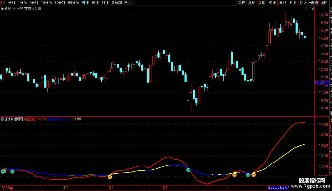 指标包含两条均线(绝密线和乾坤线)及买卖信号。