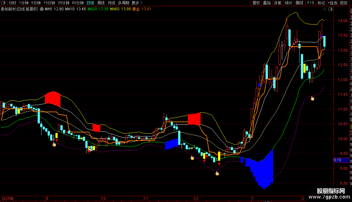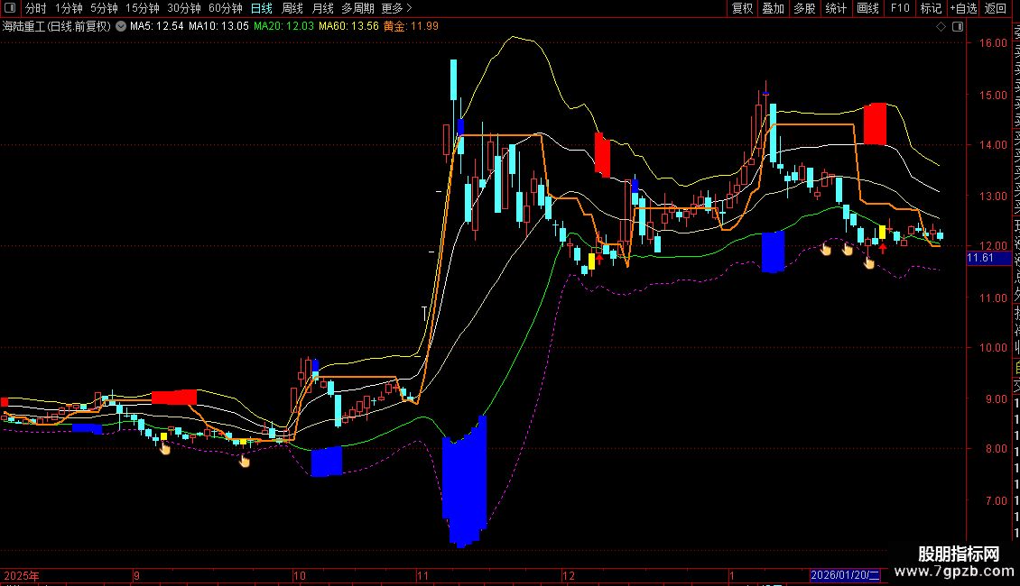 1. 布林通道系统:包含中轨(20日均线)、&177;1倍标准差的上/下轨(常规通道)以及&177;2倍标准差的上上/下下轨(极端通道),用于识别价格波动区间和超买超卖。