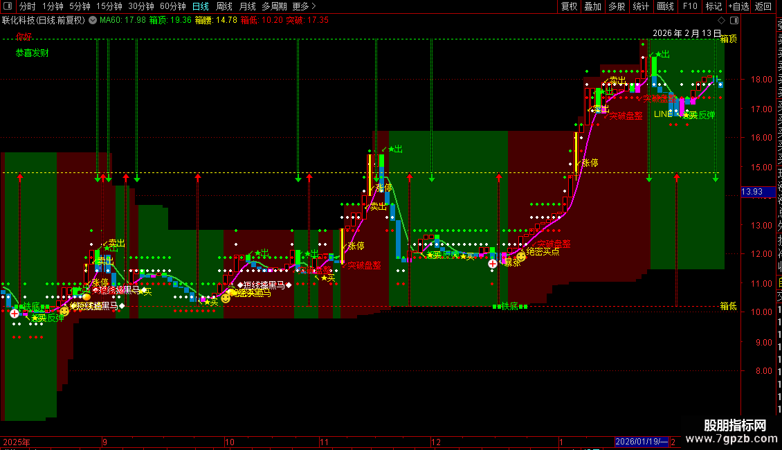 5. 箱体与支撑阻力:绘制“箱顶”、“箱腰”、“箱低”三条水平线,构成动态箱体,标识近期关键的压力与支撑区域。同时计算“突破”、“再突破”、“回踩”等关键价位线。