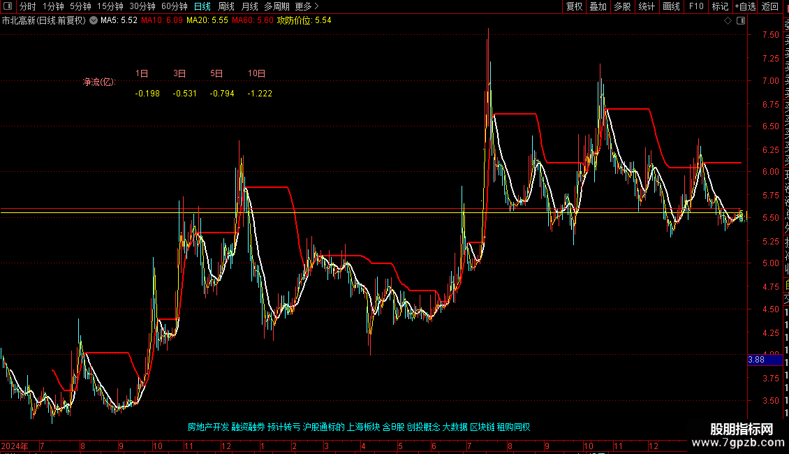 3. 资金监控:在副图区域固定显示1日、3日、5日、10日的净资金流入(亿元)数据,用于量化市场热度。
