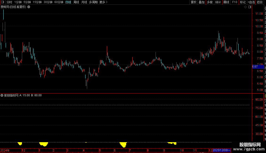 STICKLINE(短线1<15,短线1,15,8,0),COLORYELLOW;