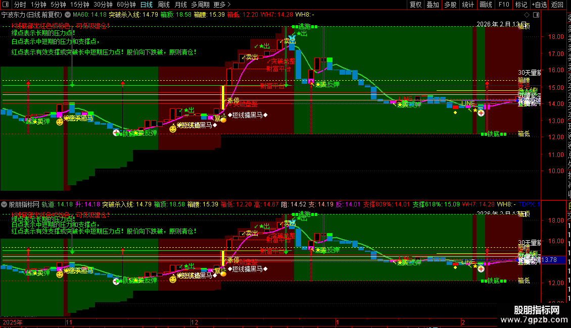 7. 箱体指标:基于历史高低点绘制箱体的顶、腰、底,并结合ZIG函数标识箱体内的转向信号。