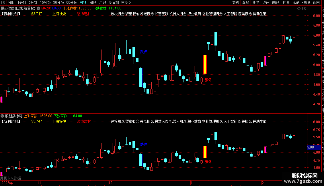 1. 特殊K线标识:用不同颜色高亮显示涨停、跌停及涨幅超过9.5%的K线。