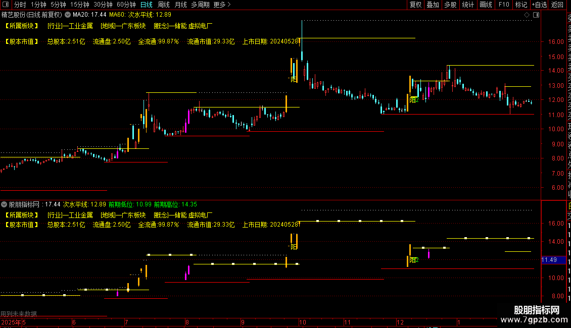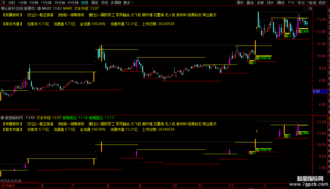 1. 信息看板:在K线图左上角固定显示个股的所属板块(行业、地域、概念)、股本数据(总股本、流通盘、全流通比例、流通市值)及上市日期。
