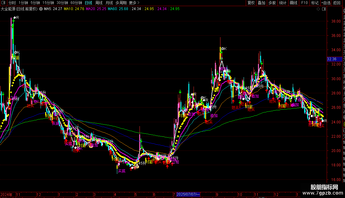 中:=EMA(C,7),COLOR00FF00,LINETHICK1;