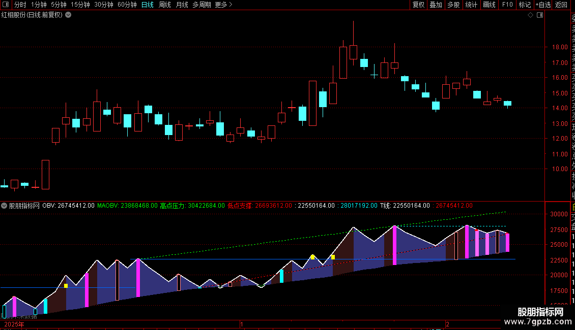 高点压力线(绿色虚线):自动识别过去一定周期(`HIGHN`,默认5)内OBV的连续高点,并连接成一条向下倾斜的压力线。
