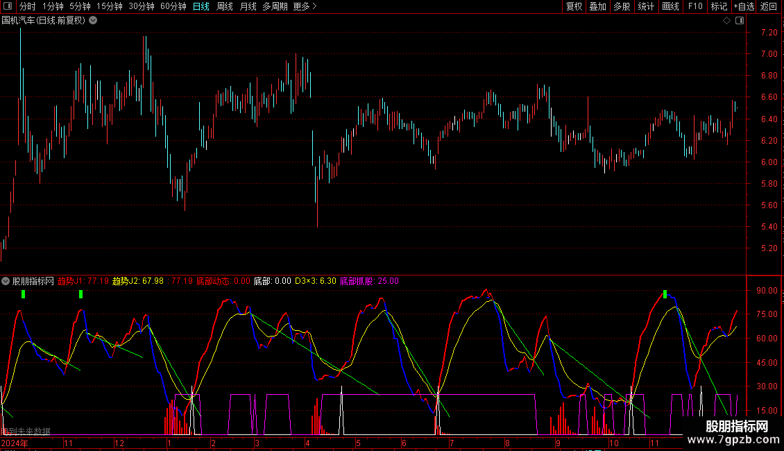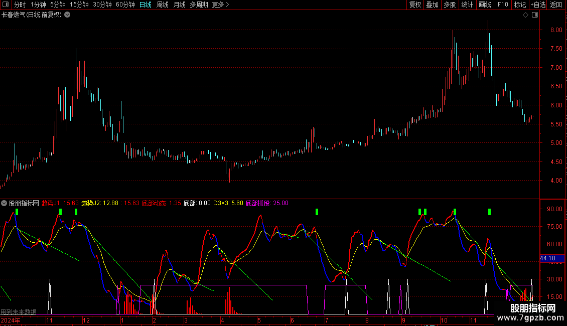 抢反弹:= IF(CROSS(K,D) AND BBIAS<-6 AND D<16 AND CLOSE>REF(CLOSE,1),80,0),COLOR00FF00;