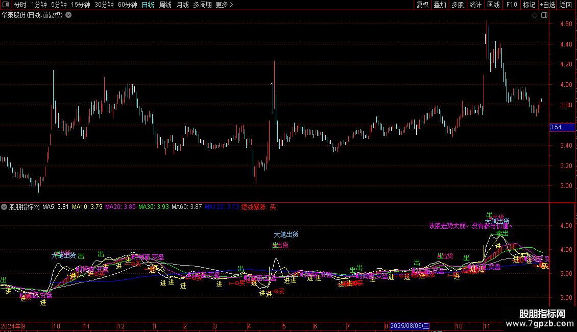 ,'该股走势趋弱,量能不足,减持大部分筹码'),COLORFF00FF ;