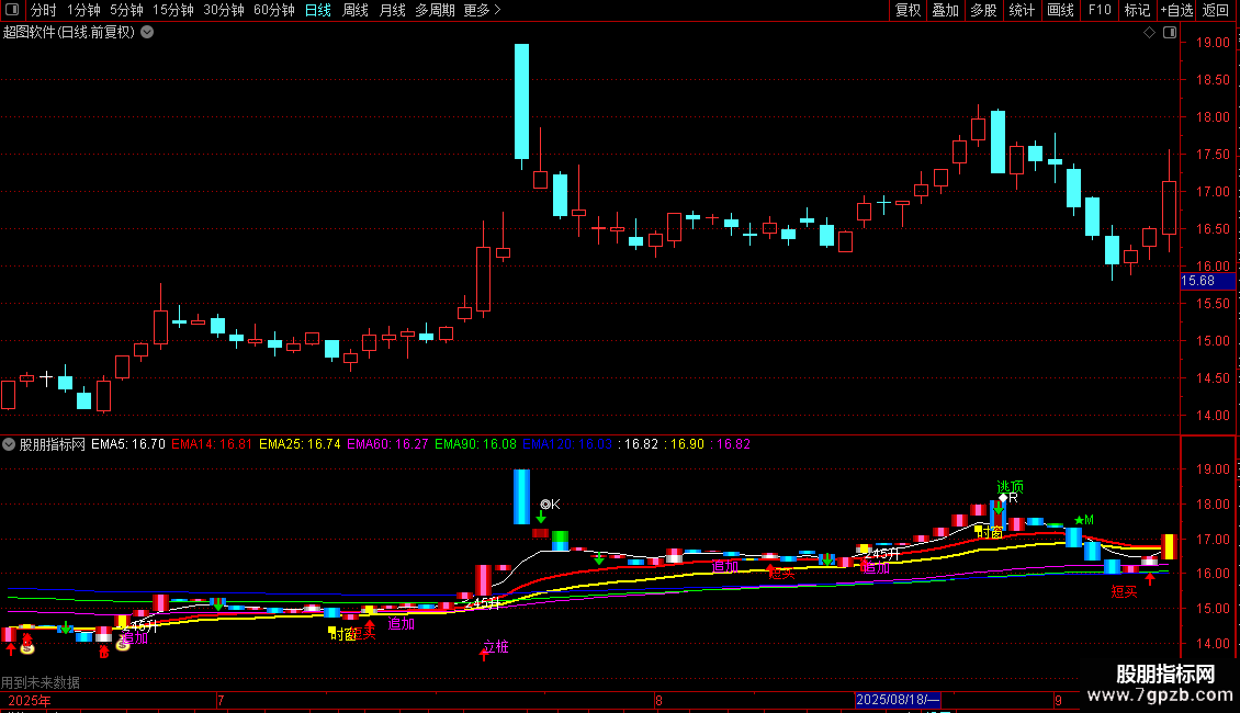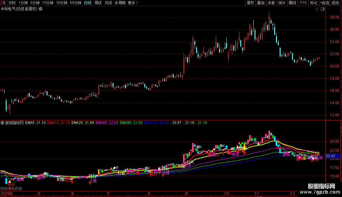 下:=EMA(中,5),COLORWHITE,LINETHICK1;