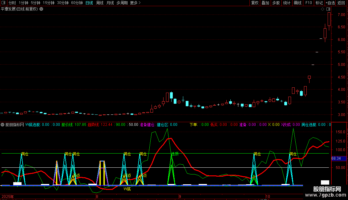 准备:(IF(((动向趋势线 > 88) AND (神偷线 < 5.8)),68,0)),LINETHICK1,COLORFF00FF;