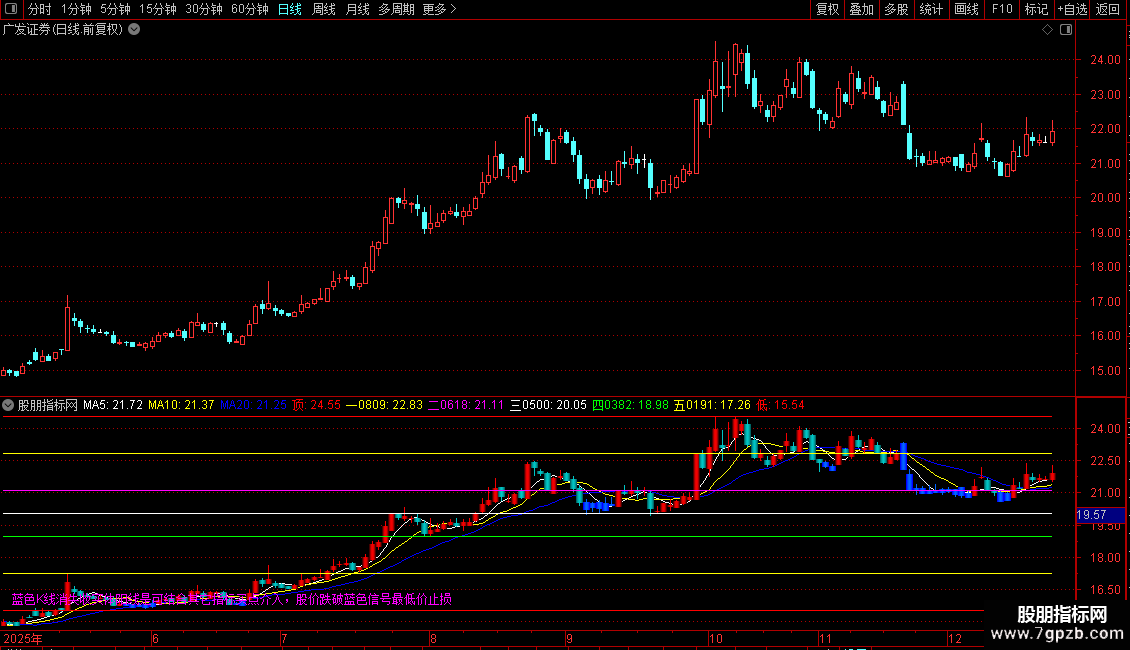DRAWTEXT_FIX(1,0.01,0.82,0,'蓝色K线消失收实体阳线是可结合其它指标买点介入,股价跌破蓝色信号最低价止损'),COLORMAGENTA;