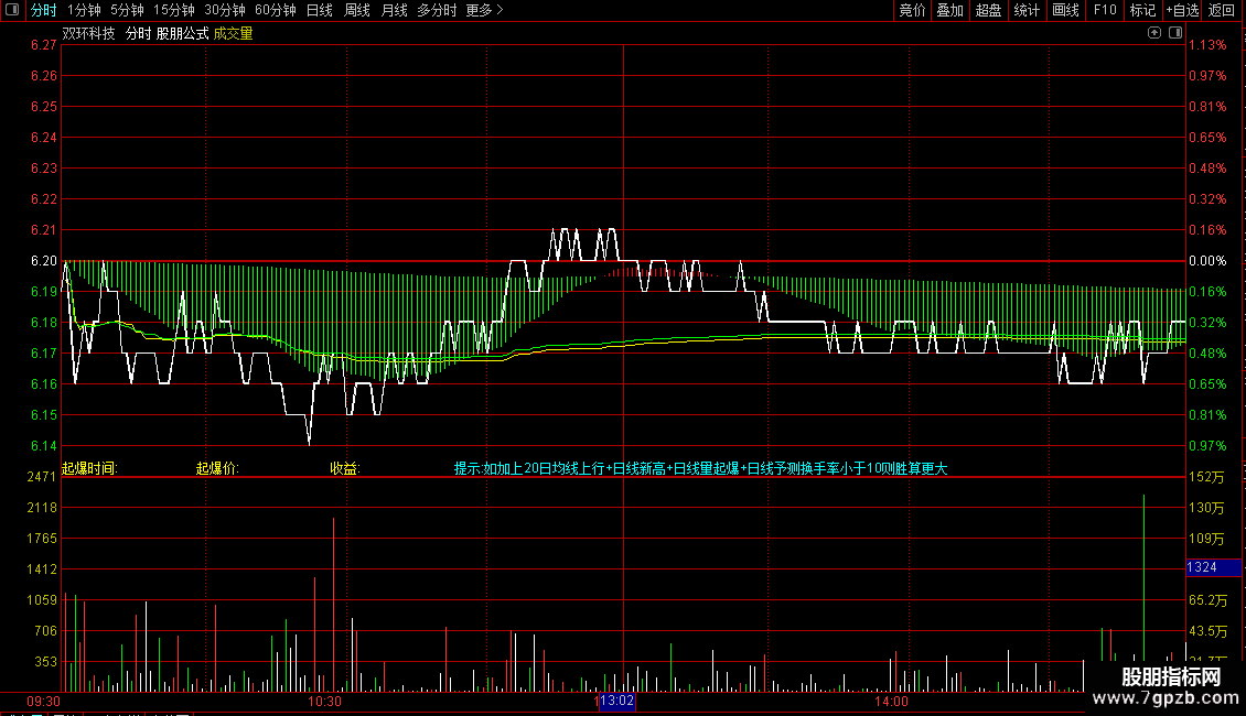 DRAWTEXT_FIX(ISLASTBAR,0.35,1,0,'提示:如加上20日均线上行+日线新高+日线量起爆+日线予测换手率小于10则胜算更大'),COLORFFFF00;