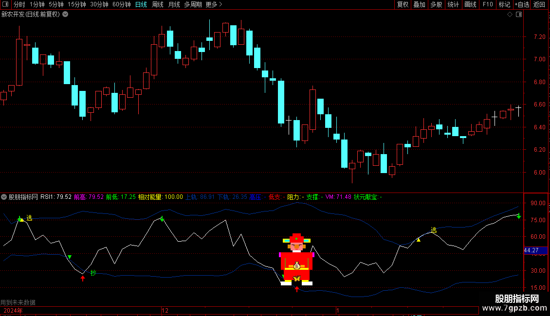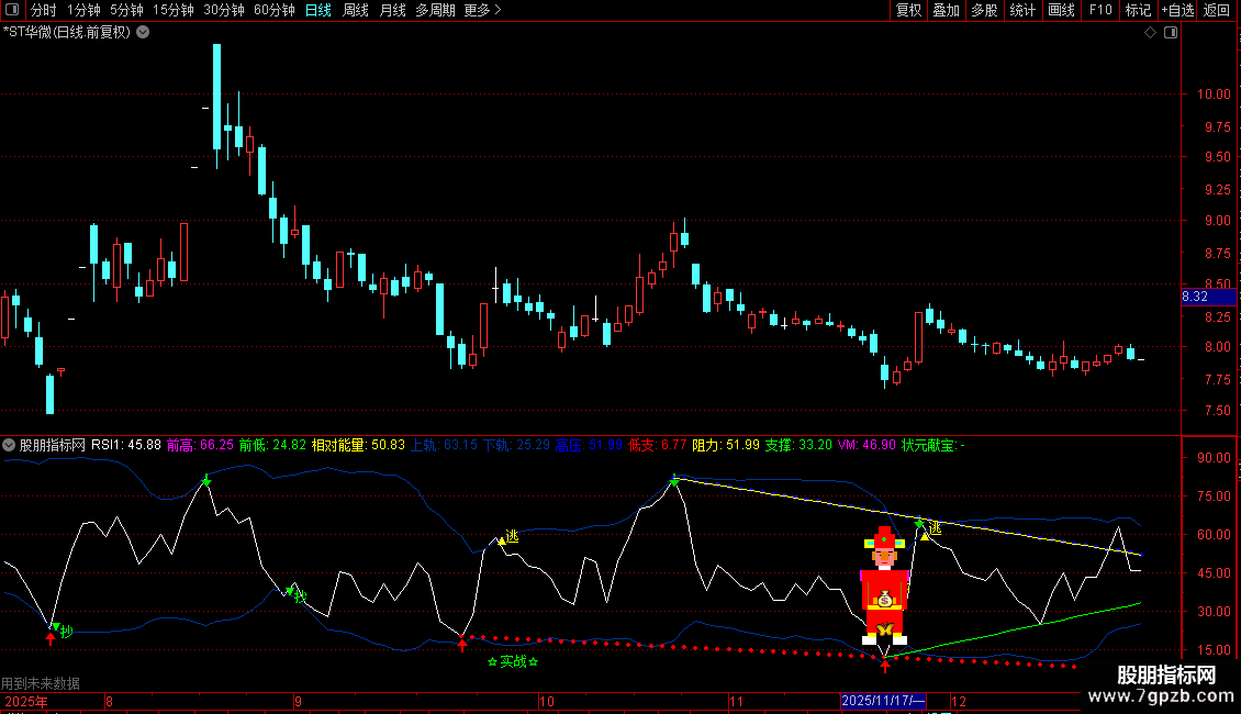 状元献宝:IF(状元郎,58,DRAWNULL),LINETHICK4,POINTDOT,COLORGREEN;