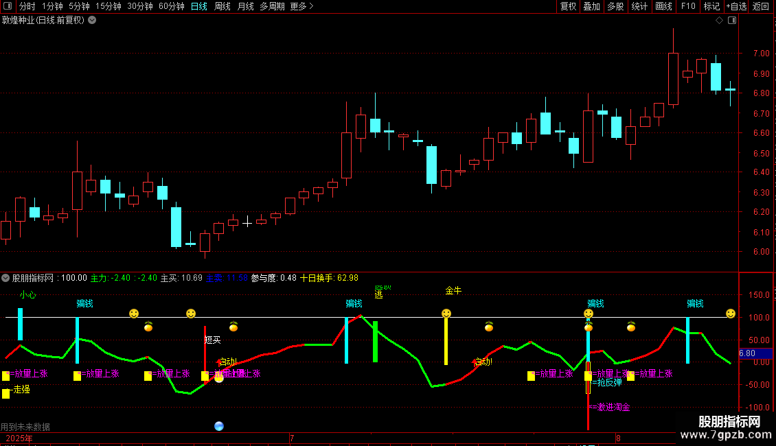 DRAWTEXT(REF("KDJ.J",1)<0 AND "KDJ.J">0,50,'短买'),COLORWHITE;