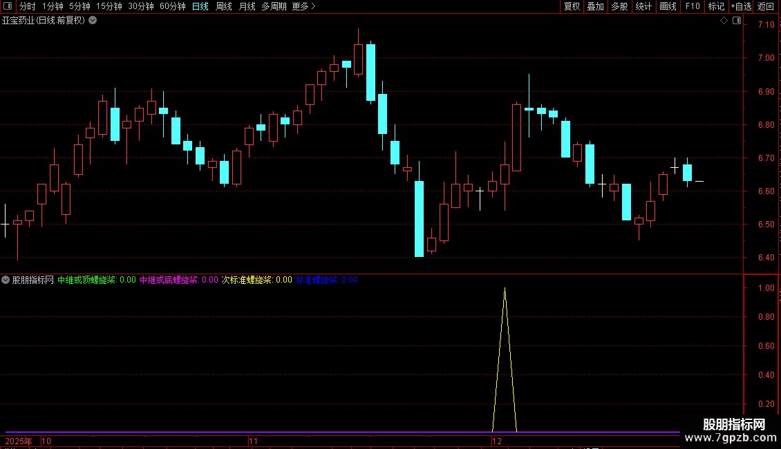 次标准螺旋桨:NOT(GLXJ) AND NOT(DLXJ) AND (H-MAX(C,O))/(H-L)>0.2 AND (MIN(C,O)-L)/(H-L)>0.2 AND (H-L)/O>0.03,COLORYELLOW;