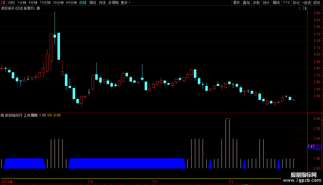STICKLINE(COUNT(上攻周期>3,5)>=3 AND SG,0,上攻周期,1.5,0),COLORRED;