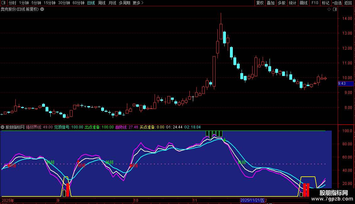 DRAWTEXT(CROSS(49,趋势线),52,'转弱'),COLORGREEN;