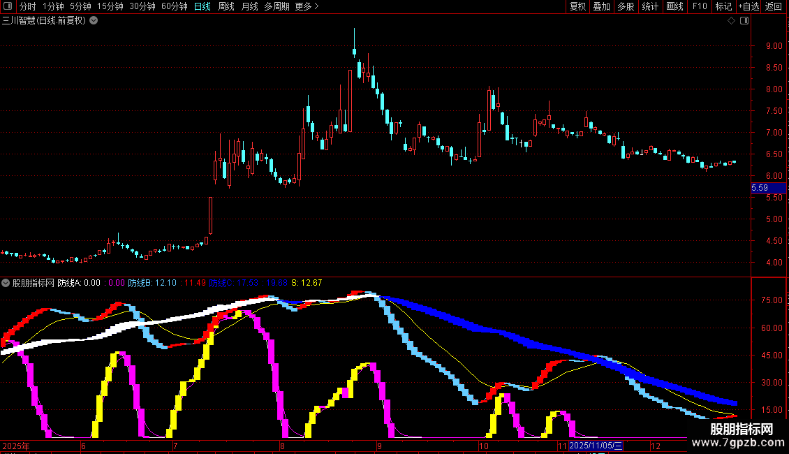 S:=EMA(0.382*REF(防线B,2)+0.618*防线B,12),COLORYELLOW;