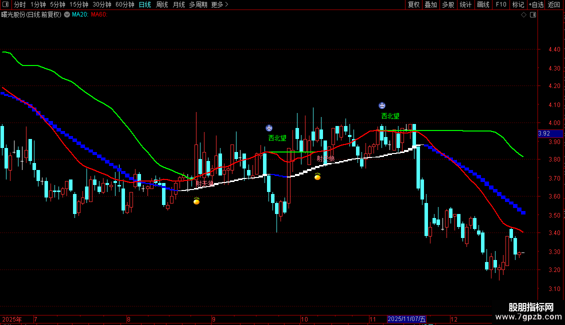 DRAWTEXT(REF(绿线,1)=REF(红线,1) AND 绿线>红线,绿线*1.02,'西北望'),COLOR00FF00;