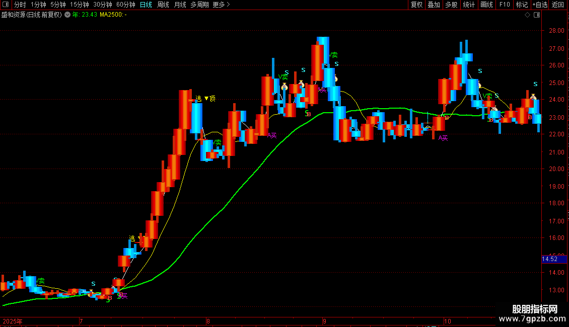 A赋值:S的5日简单移动平均,画绿色,,线宽为2