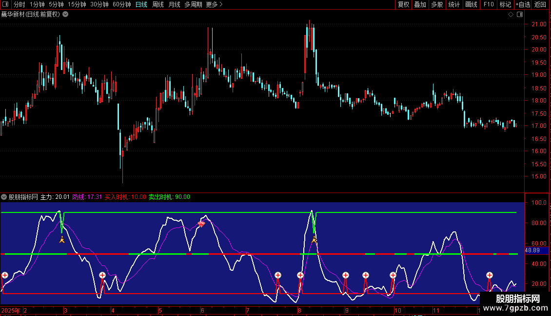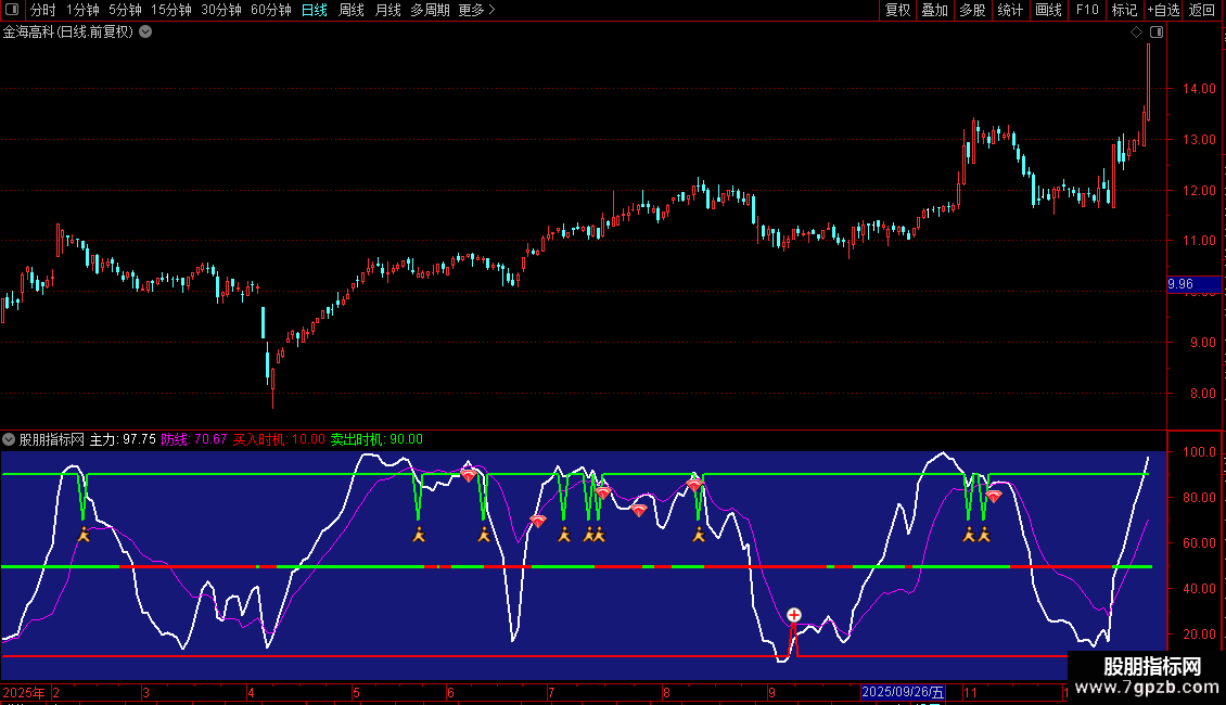 卖出时机: IF(CROSS(90,主力),70,90),LINETHICK2,COLORGREEN ;